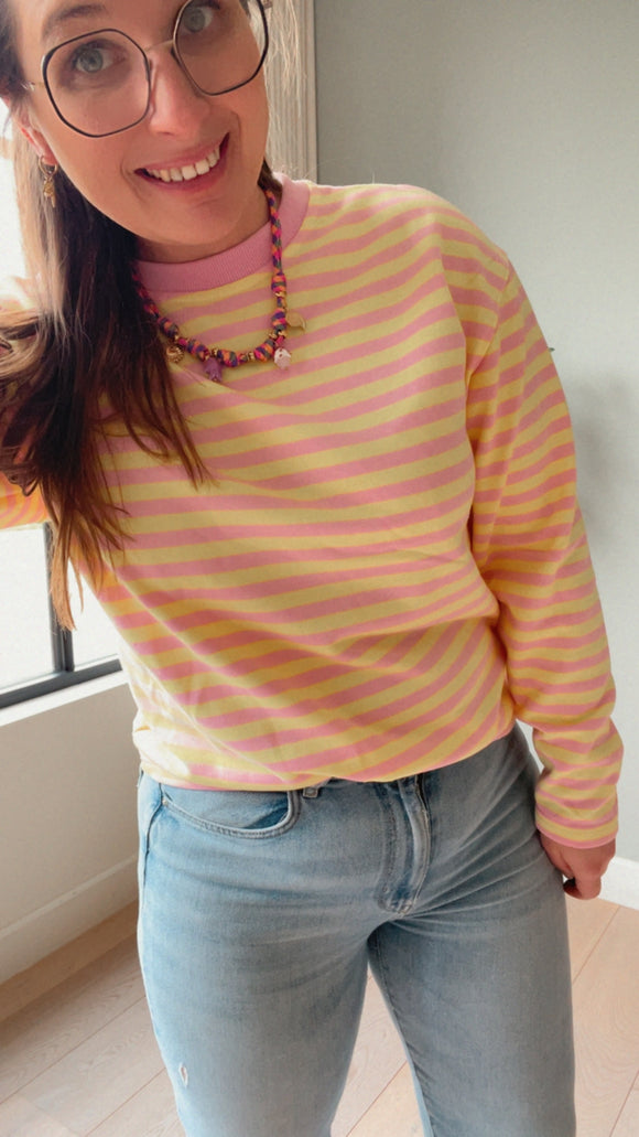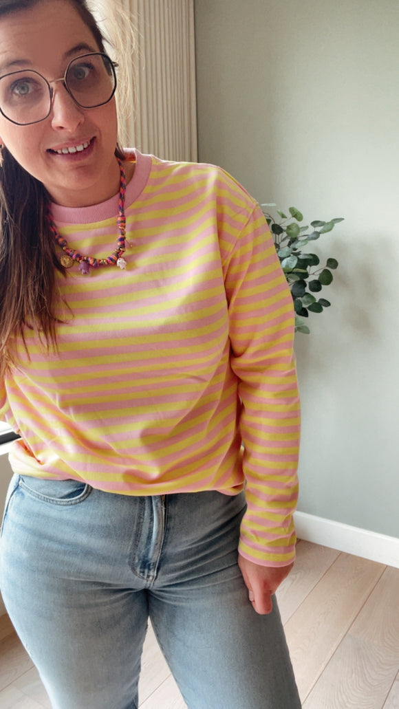 Lia stripe longsleeve in sweaterstof geel/roze dames