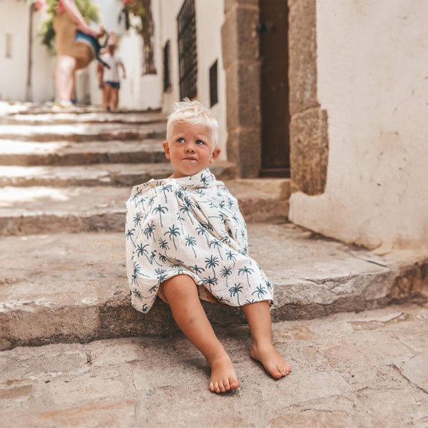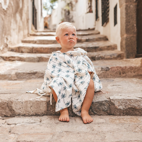 De Steve poncho is perfect voor een dagje strand, na een badje of na de zwemles. De poncho heeft een unieke, zelfgetekende palmboomprint die echt dat zomergevoel naar boven haalt. Daarnaast is de Steve poncho uitgevoerd in 100% katoen, voelt zacht aan en droogt snel op. Verder heeft de poncho een capuchon en zijn er aan beide zijkanten twee stukjes stof verwerkt die je aan elkaar kunt knopen om te zorgen dat de poncho goed op zijn plek blijft zitten. Heb jij de stoere Steve poncho al toegevoegd aan je winkelmandje?