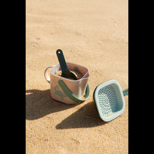 De zandemmer set is perfect voor uitstapjes naar het strand en om de natuur te verkennen. Hij bevat een gieter, doorzichtige emmer, trechter, schep en zeef, allemaal ontworpen om buiten spelen leuk te maken en de nieuwsgierigheid van je kleintjes te ondersteunen.