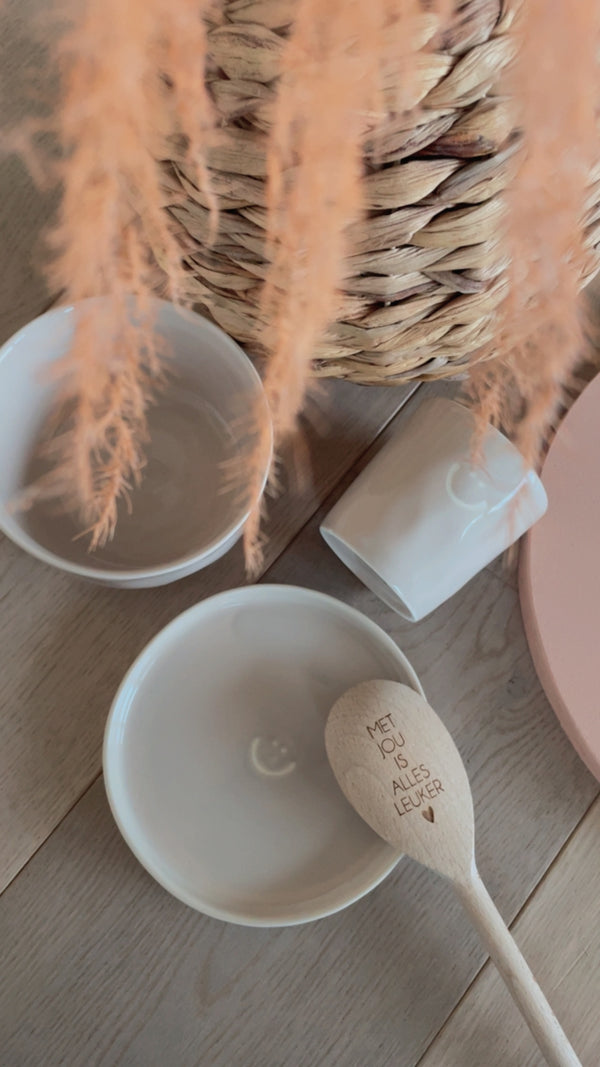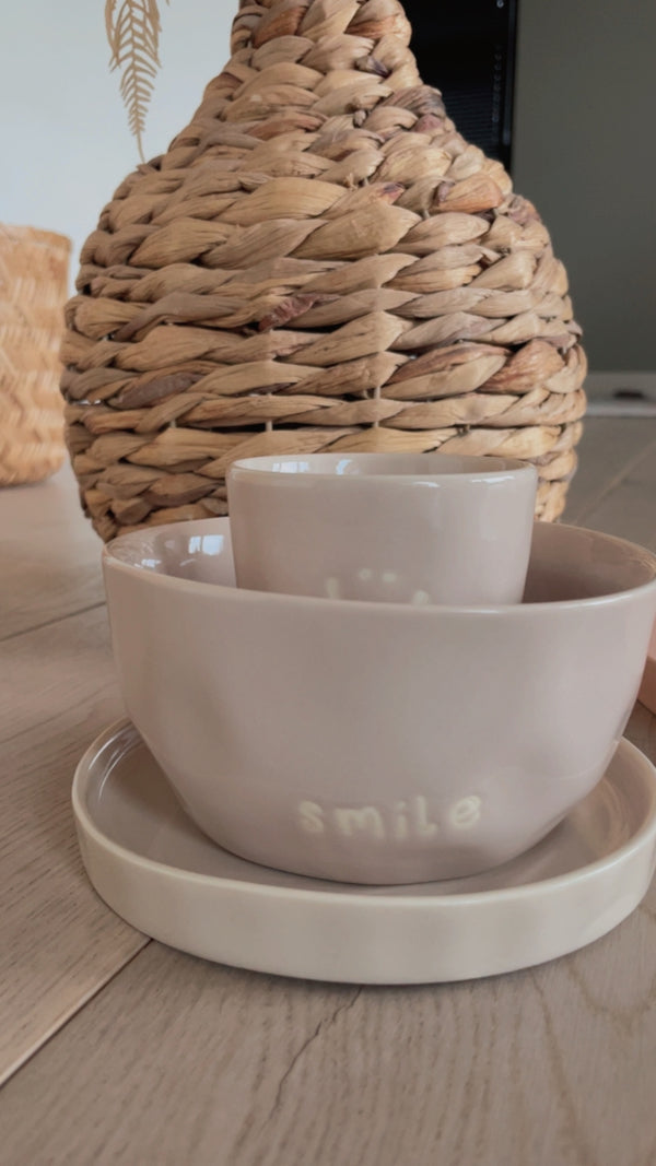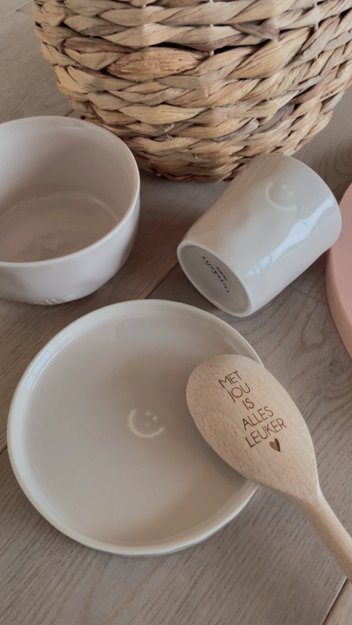 Deze leuke giftset bestaat uit een bord en mok met een smiley en een kom met de tekst smile