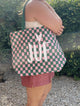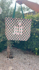 Canvas tas met vakjes groen/roze met tekst juf is in bestelling en wordt verzonden zodra het weer op voorraad is