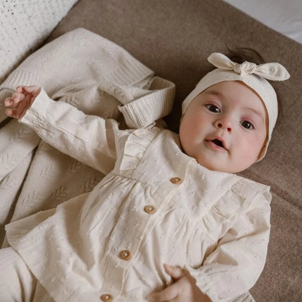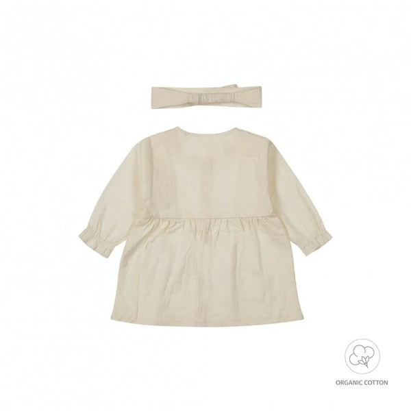 Start de dag in stijl met deze mooie Dirkje jurk, gemaakt van organic cotton. De jurk met lange mouwen is off white en voorzien van een ingeweven stip dat het jurkje extra leuk maakt. De ecru meisjes jurk is voorzien van leuke ruffles en knoopjes op de voorzijde. De bijpassende haarband met strikje maakt de outfit van je meisje helemaal compleet. Organic cotton babykleding is de ideale keuze voor ouders die het beste willen voor hun baby's. Gemaakt van biologisch geteelde katoen, is deze kleding zacht, comfortabel en veilig voor de gevoelige huid van baby's. Bovendien draagt het bij aan een gezondere planeet door duurzame en milieuvriendelijke teeltpraktijken. Kies voor bio katoen om je baby te verwennen en de wereld te beschermen.