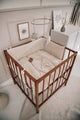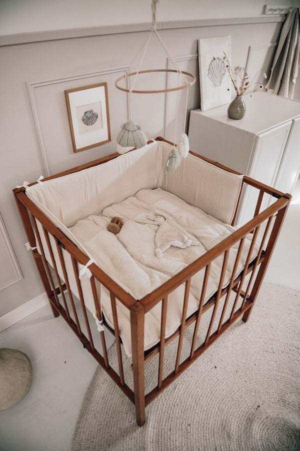 De box staat meestal in je woonkamer en daarom is het mooi als je de box accessoires qua kleur en stof kan afstemmen op je interieur. Het belangrijkste aan deze boxbumper is uiteraard de bescherming tegen tocht en tegen het stoten aan de spijlen van de box. Je kunt de bumper gemakkelijk aan de spijlen van de box bevestigen met de daarvoor bestemde koordjes. Er zitten meerdere bevestigingskoordjes over de gehele breedte van het kussen zodat hij goed verdeeld en vastgestrikt kan worden.