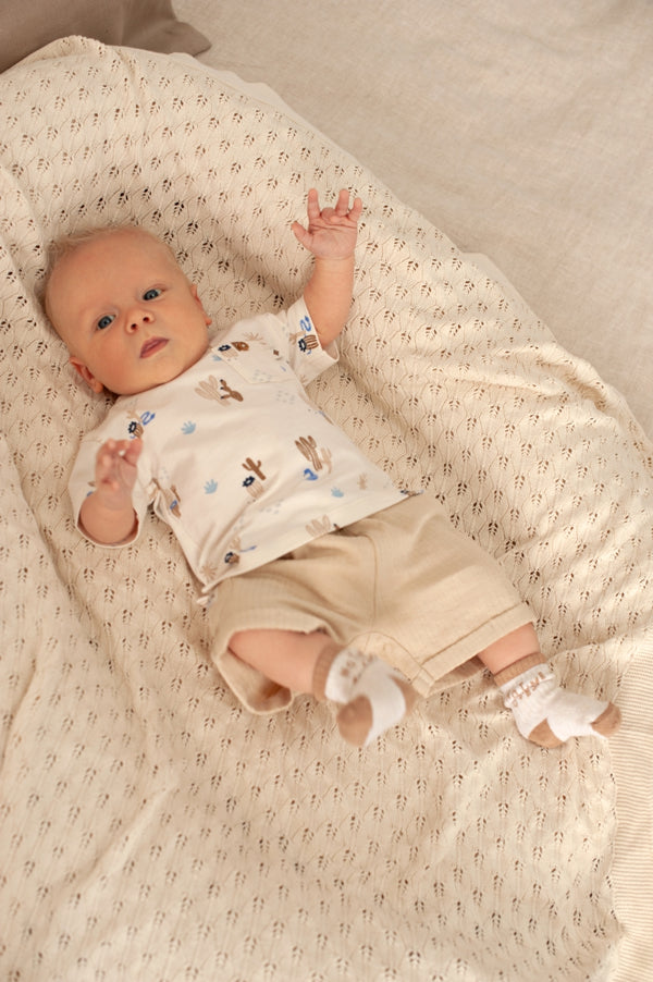 Cute en zacht! Dat is de t-shirt van feetje uit de nieuwe collectie sssiesta . Deze t-shirt is gemaakt van zacht katoen en heeft een leuke aop met cactussen. Combineer deze t-shirt met de jumpsuit of de short uit de sssiesta collectie. Verkrijgbaar vanaf maatje 56 tem 86
