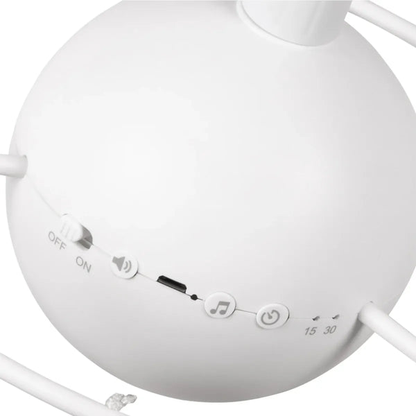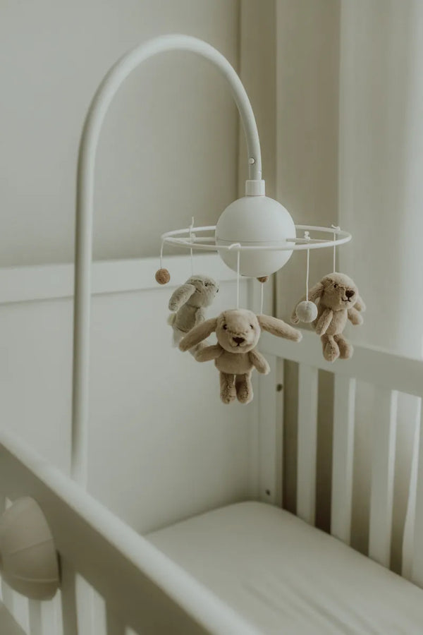Onze Milo boxmobiel is een hippe mobiel die je baby kan kalmeren door de lieve melodietjes en zijn leuke konijnen vriendjes. Je kan kiezen uit vier verschillende melodieën, Mozart en Meditatie zijn onze favorieten! De mobiel heeft een optionele timer functie waarbij je kunt kiezen uit 15 en 30 minuten. Hij is oplaadbaar en komt met een afstandsbediening. Naast dat de mobiel er leuk uit ziet en leuke melodietjes heeft, is deze ook goed voor de visuele ontwikkeling van je baby! Kijk naar de product video om een nog beter beeld te krijgen van de mobiel en alle melodietjes te beluisteren!