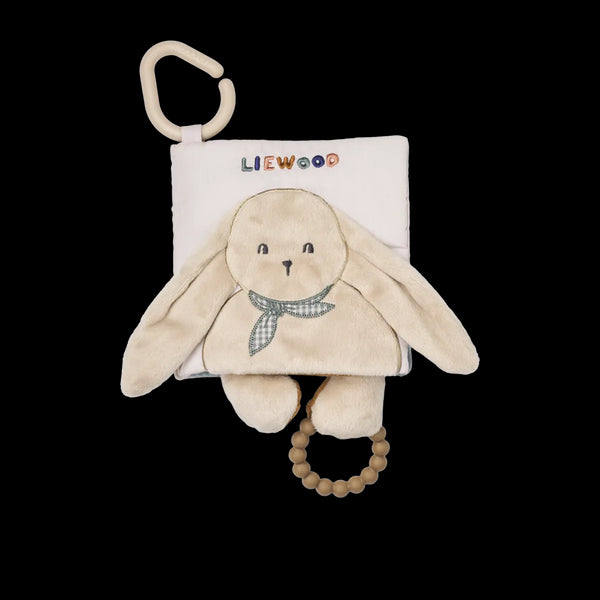Extra zacht pluche stoffen boekje dat knispert van liewood. Gemaakt van 100% gerecycled polyester en versierd met een schattig konijntje op de voorkant met aangehechte oren en een staartje op de achterkant. Het boekje is voorzien van speelse en tactiele elementen voor de baby om te ontdekken. Een bijtring van siliconen hangt aan het boekje en is inclusief met een spiegel en knisperende stofjes voor zintuiglijk speelplezier.