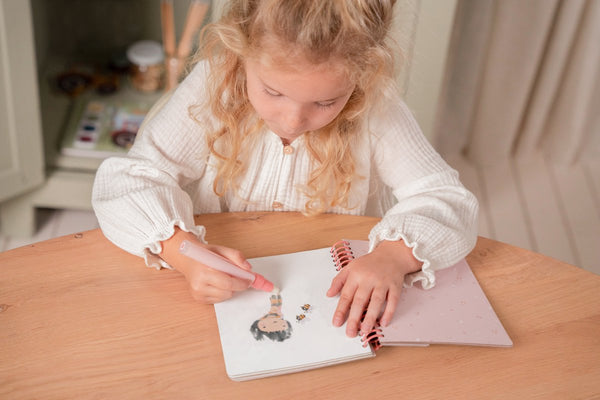 Wauw, zo wordt tekenen magisch! Met dit Little Dutch Rosa & Friends watertekenboek maak jij de mooiste creaties van onder andere Rosa, Evi en Julia in de bloementuin. Op elke pagina is alvast een stukje ingekleurd zodat je een hint hebt van de tekening die er verborgen zit. Vul de bijgeleverde speciale pen met water en begin met tekenen. Wanneer water op het karton terecht komt verschijnen er de mooiste, vrolijke tekeningen. Als het papier opdroogt kun je de tekening weer opnieuw maken, waardoor je keer op keer plezier hebt. Het boek is gemaakt van stevig karton met herkenbare Little Dutch designs en kleuren en heeft een handige ringband. De ideale activiteit voor thuis en onderweg!