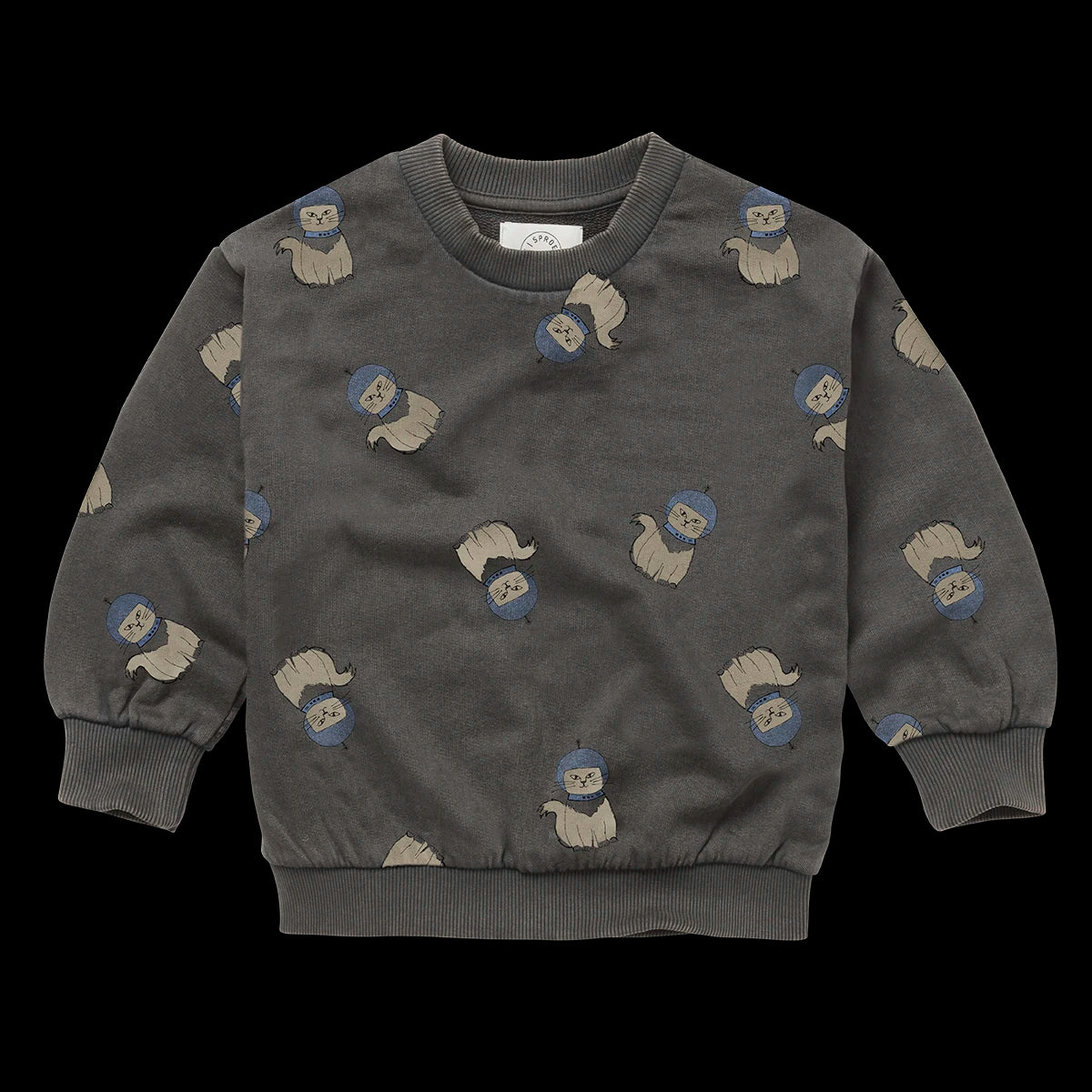 This sweatshirt in washed black is made from soft organic cotton and brushed inside for extra comfort. Featuring the subtle yet playful all-over ‘Space Cat’ print, designed in collaboration with “Gisele et Rose” — a cosmic twist with a smile.