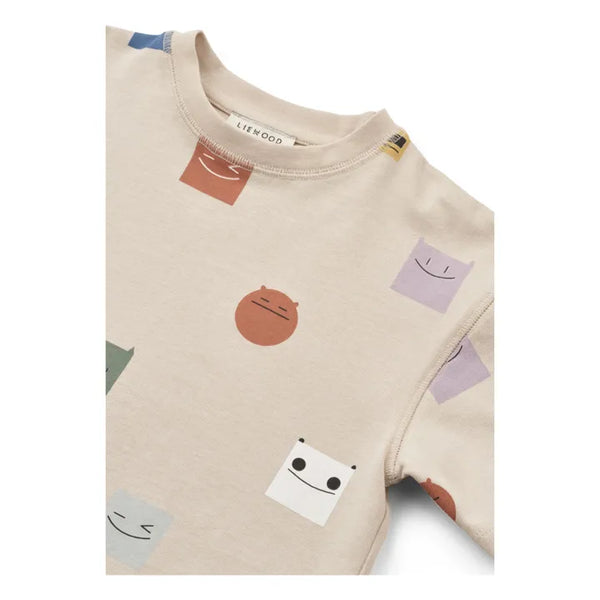 Speelse boxy t-shirt van het merk Liewood . De t-shirt heeft een all over print met leuke smiley gezichtjes en is 100% GOTS gecertificeerd. Makkelijk te combineren voor een coole look .