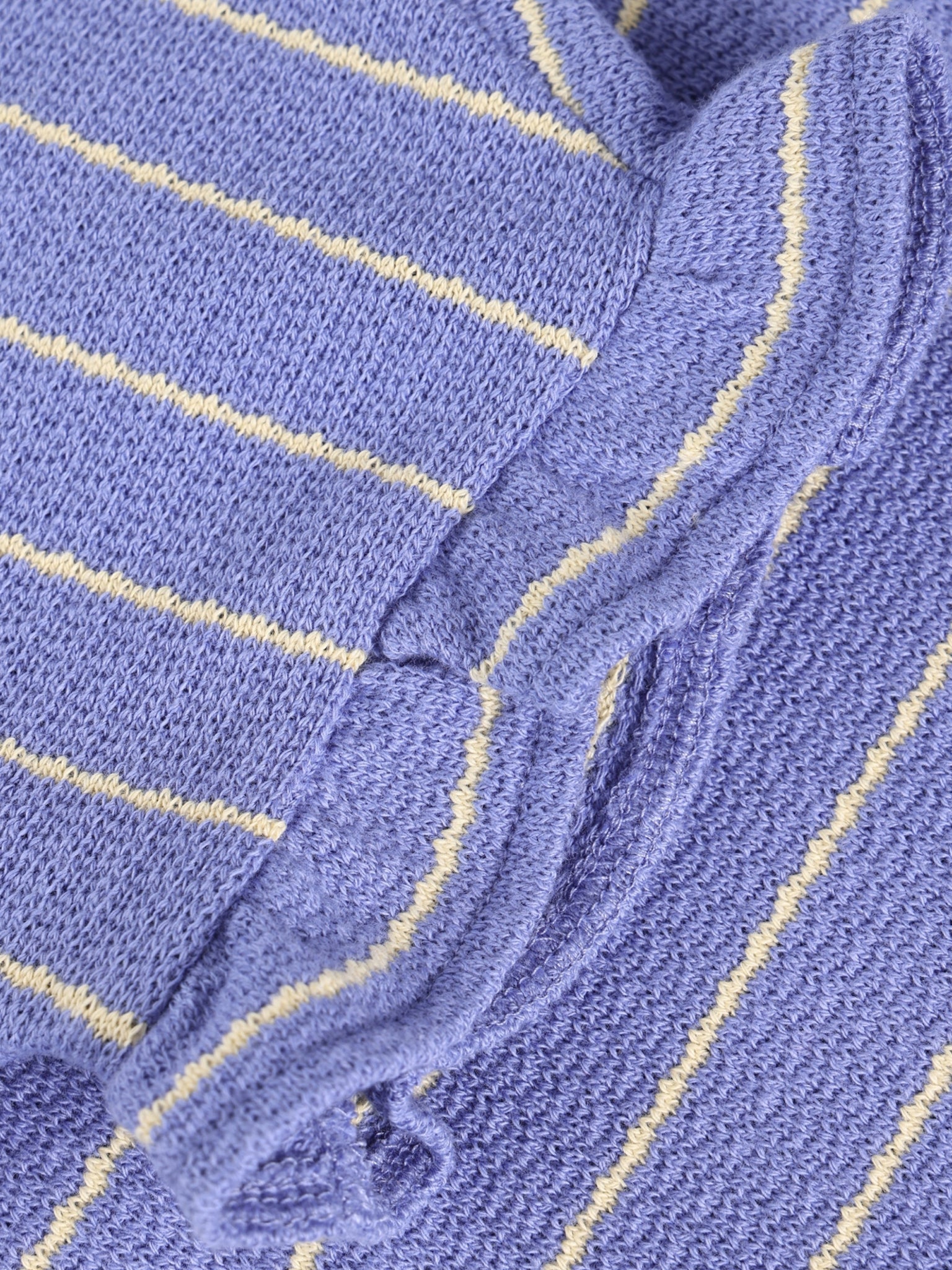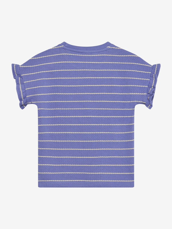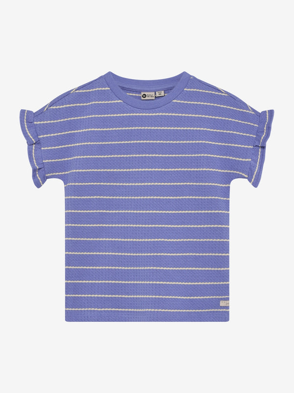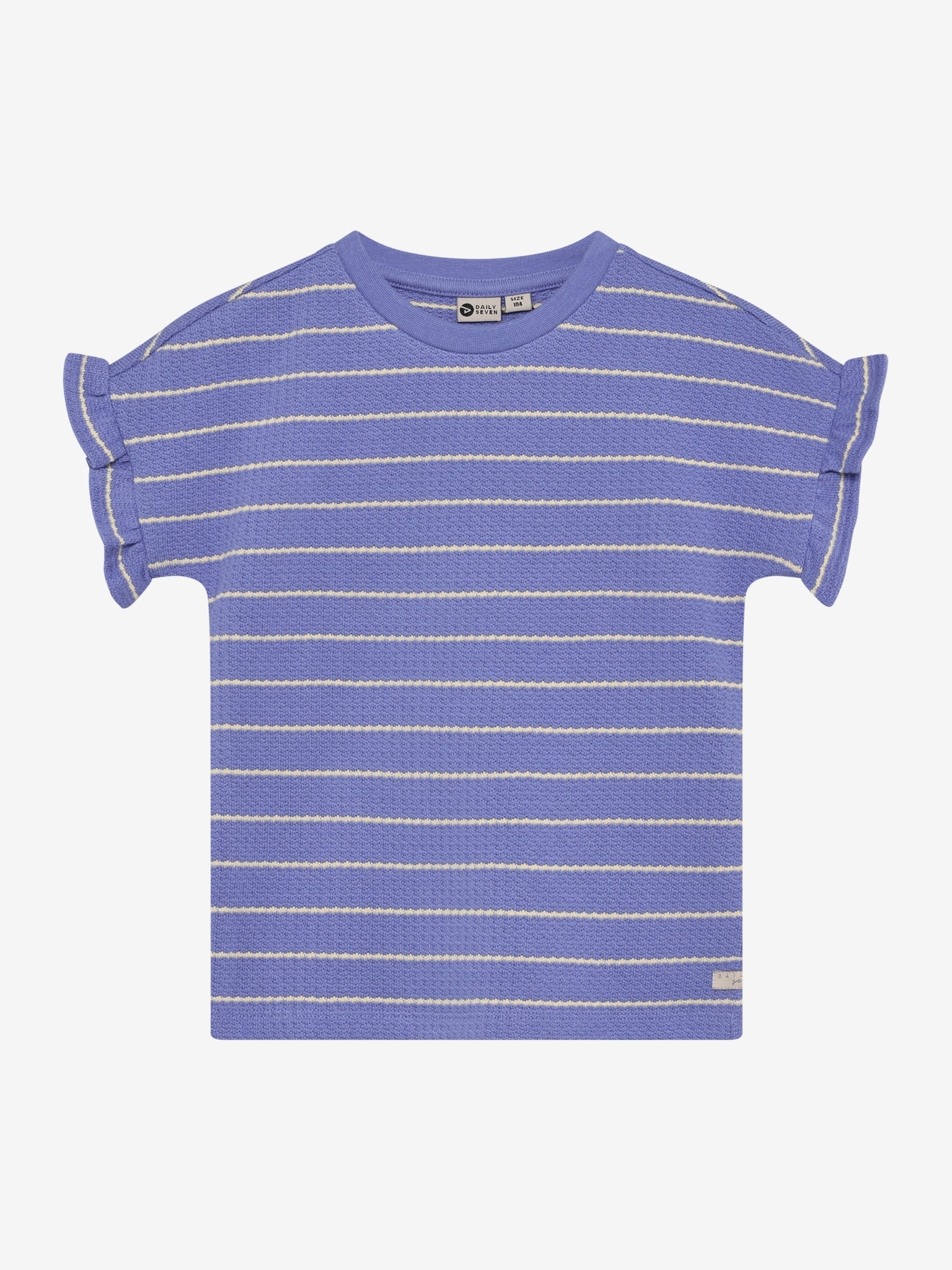 Speels meisjes t-shirt van daily7 met een ruffle mouw in de kleur lila en met een fijn oker geel streepje. Leuk te combineren op de jeansshort ( drop2) . verkrijgbaar vanaf maat 92 tem 128